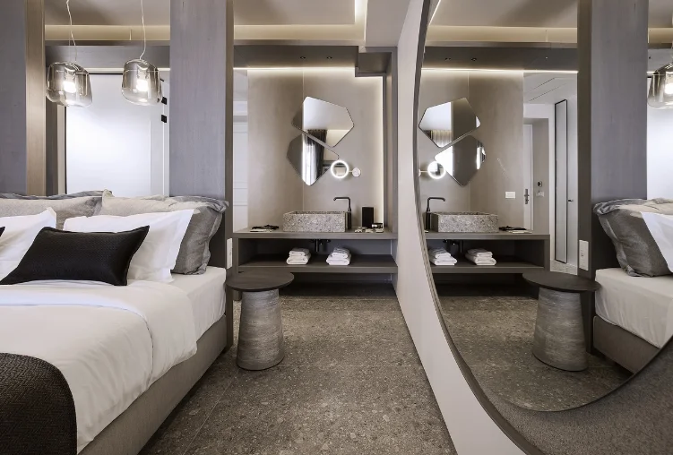 Many suites offer private infinity pools, outdoor whirlpools, or panoramic terraces, creating an intimate space to relax while overlooking the sea.