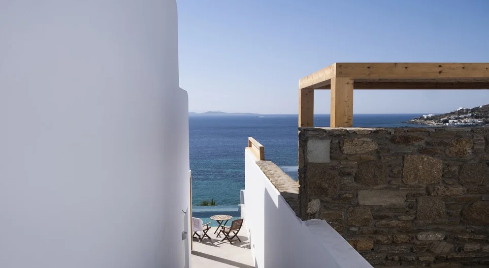 Set on a hillside overlooking the Aegean Sea, the hotel enjoys one of the most beautiful sunset viewpoints on the island. The atmosphere feels private and peaceful, yet Mykonos Town is only a short taxi ride away.