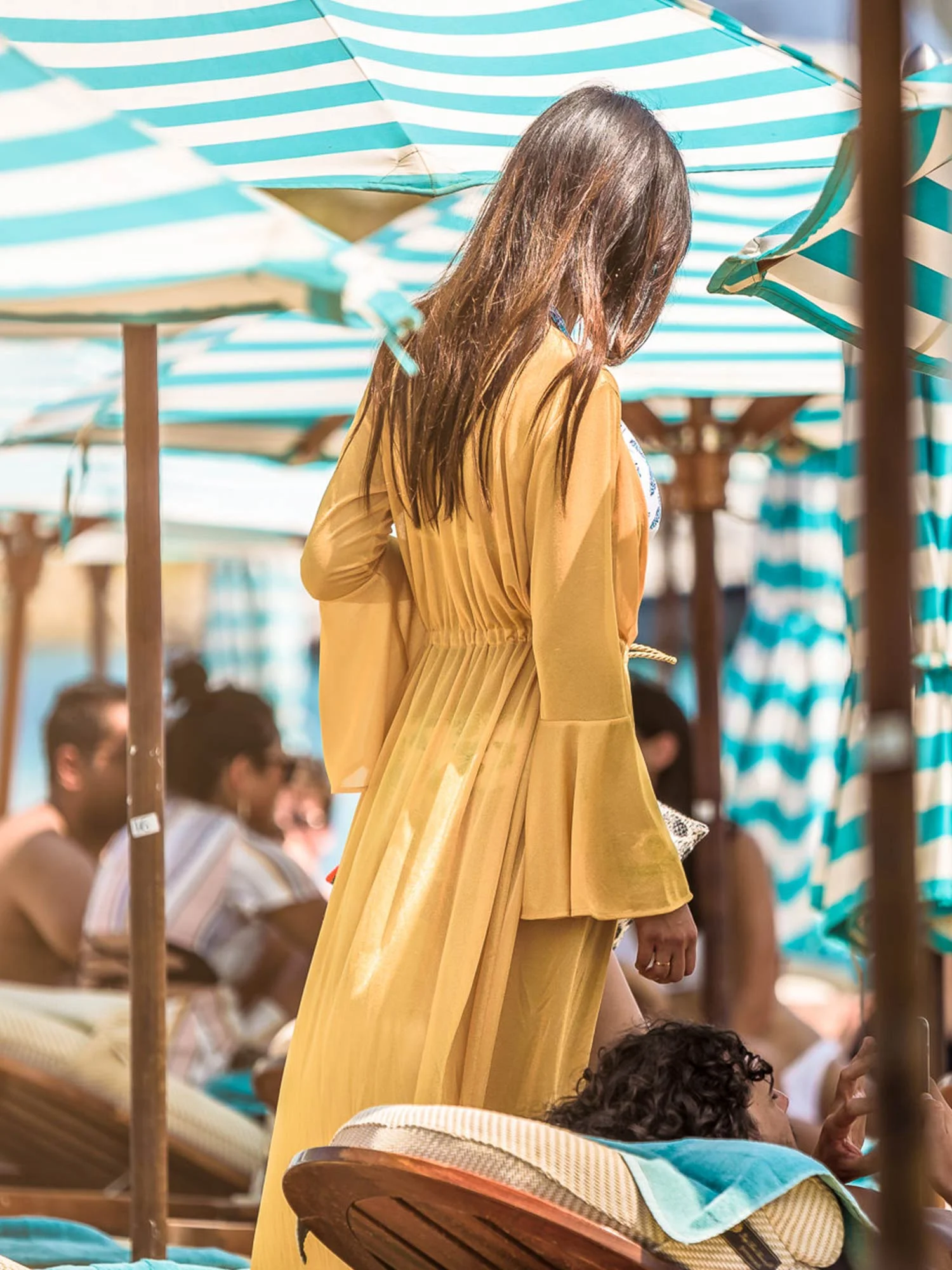 Throughout the day the vibe is relaxed and stylish. By afternoon, the energy rises as music fills the beach and the restaurant begins to buzz with guests arriving for long seaside lunches.